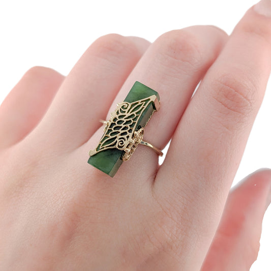 Vintage Resco 10K Gold Jade Ring – Carved Green Jade, Sculptural Filigree Statement Ring