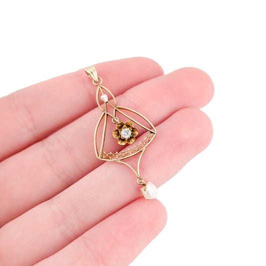 Victorian 10K Gold Diamond & Pearl Floral Lavalier Pendant
