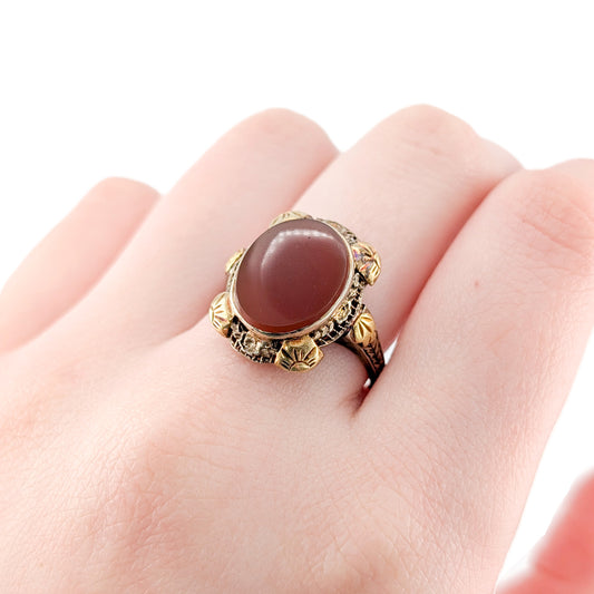 Vintage 10K Gold Carnelian Cabochon Ring – Ornate Two-Toned Art Deco Setting