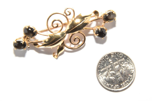 Vintage 14K Gold Floral Brooch with Black Star Sapphire Cabochons
