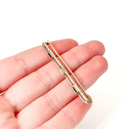 Antique Art Deco 10k White Gold Filigree Bar Pin with Sapphires and Diamond