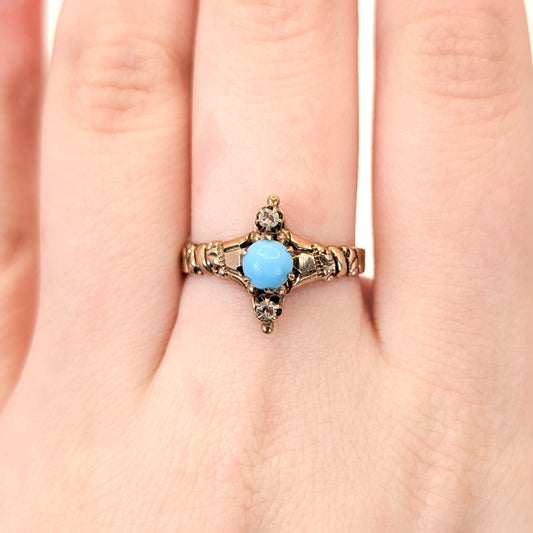Victorian 10K Gold Turquoise & Diamond Rose Cut Ring – Antique Scrollwork Setting
