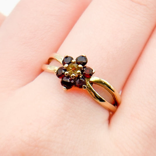 Vintage 9K Gold Garnet Flower Cluster Ring – Citrine Accent