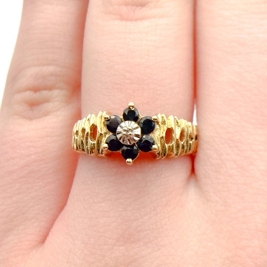Vintage 10K Gold Sapphire & Diamond Cluster Ring – Floral Design – 2.75g