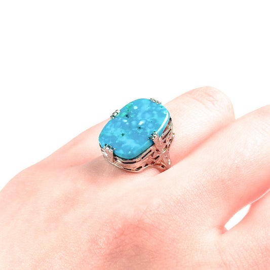 Art Deco 14K White Gold Turquoise Ring with Intricate Filigree Design