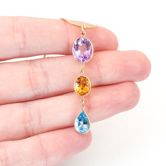 14K Gold Amethyst, Citrine & Blue Topaz Drop Pendant Necklace (Snake Chain Included)