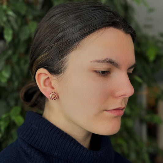 Vintage 18K Gold Ruby Cluster Earrings – Floral Studs
