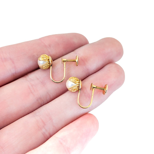 14K Yellow Gold Cultured Pearl Screw Back Earrings – Retro 1940s Jewelry