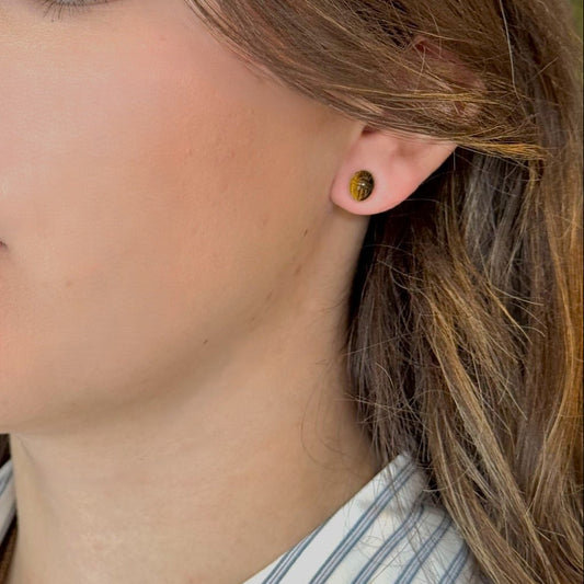 Vintage 14K Gold Tiger’s Eye Scarab Stud Earrings – 8.5mm x 6.5mm – Push-Backs – 1.2g – Egyptian Revival