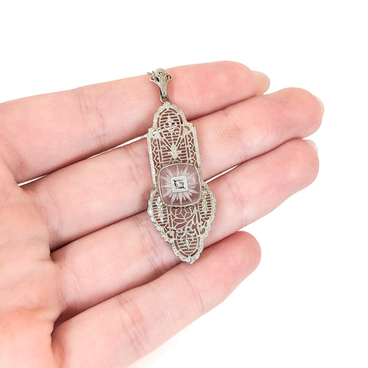 Art Deco 10K White Gold Filigree Pendant with Diamond and Camphor Glass Center