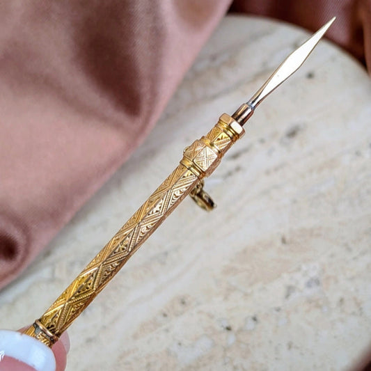 Victorian 14K Gold Retractable Antique Toothpick – Ornate Engraved Mechanical Design
