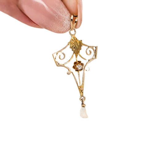 Antique 10K Gold Diamond & Pearl lavalier Pendant – Openwork Floral Scroll Design