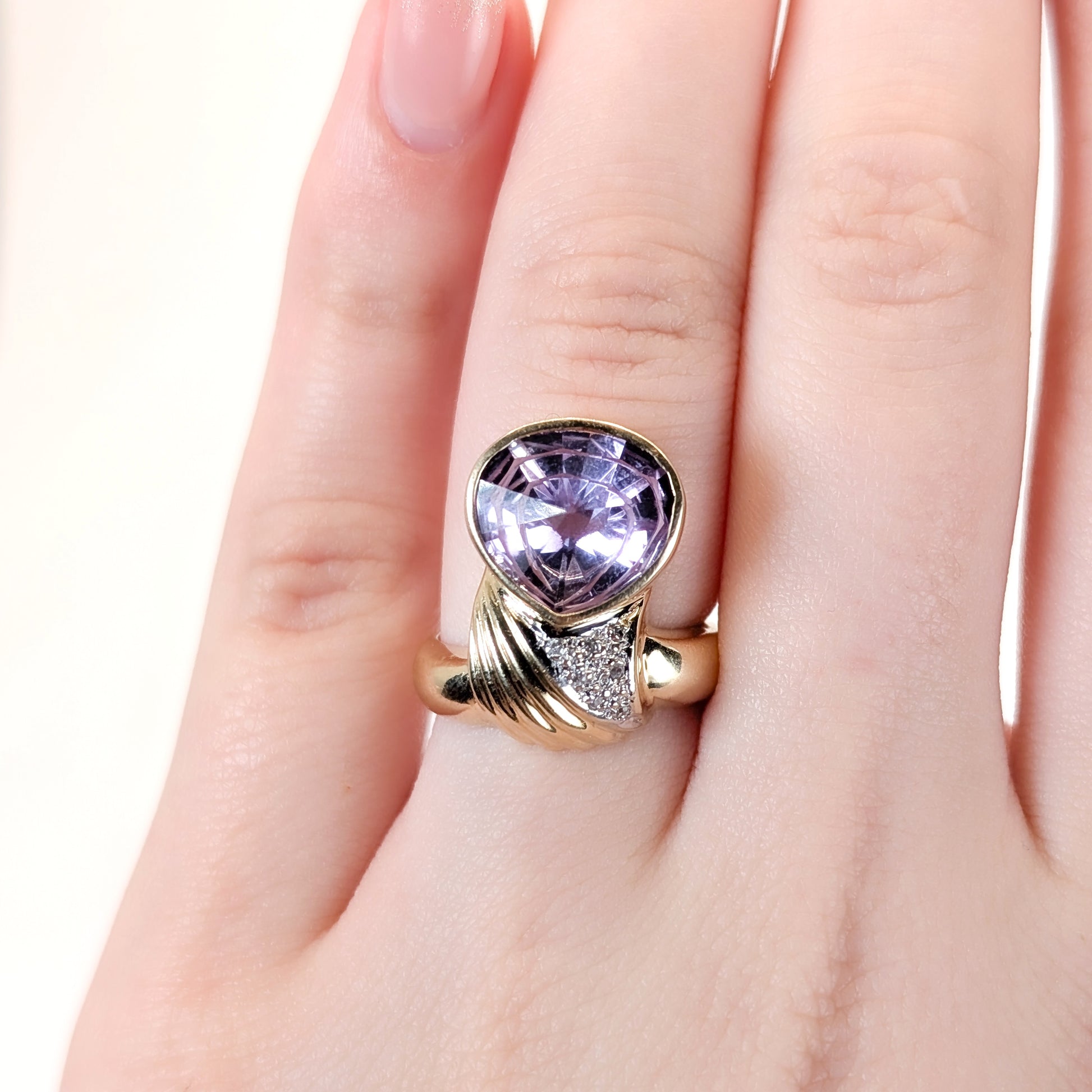 Sweeping ridged gold elements wrap gracefully around one side of the amethyst, giving the design movement and dimension. Opposite the ridges, a sparkling panel of pavé-set natural diamonds adds contrast and brightness, catching the light with every turn of the hand. This asymmetrical composition is a hallmark of late 20th-century jewelry design, lending the piece a glamorous, unmistakably vintage character.