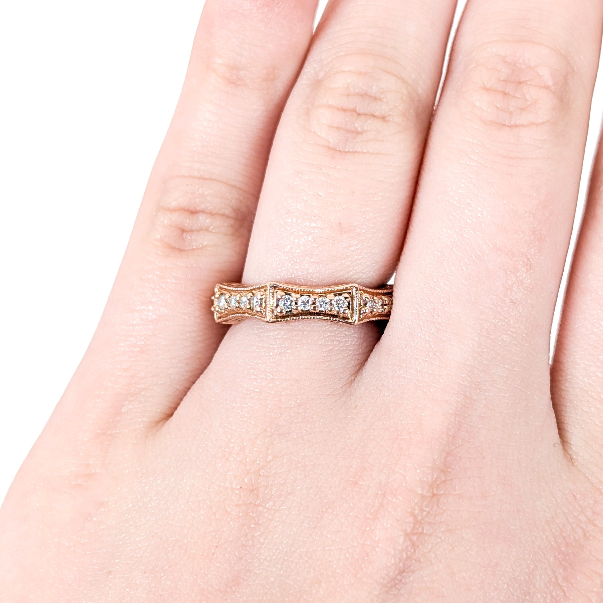 This striking estate eternity band blends geometric design with timeless sparkle. Crafted in solid 14K rose gold, the ring features an octagonal silhouette with softly curved sides, each panel adorned with round-cut diamonds set in elegant milgrain-detailed frames. The dimensional architecture gives it a sculptural feel—bold enough to wear alone yet refined enough to pair in a stack.