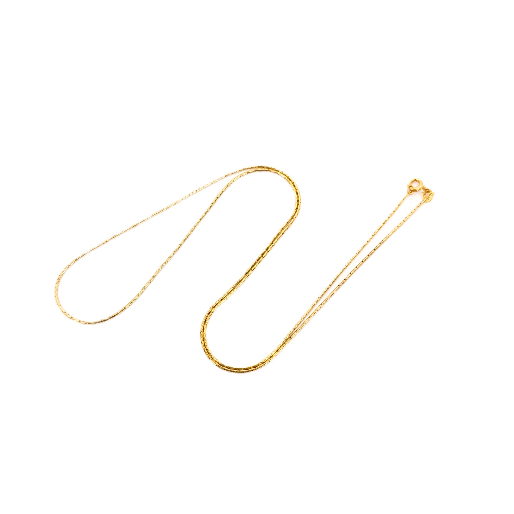 A beautifully crafted solid 18K gold necklace featuring a fine box-link design that catches light with delicate shimmer. This classic, versatile chain is ideal for wearing on its own as a minimalist everyday piece or pairing with pendants and charms.