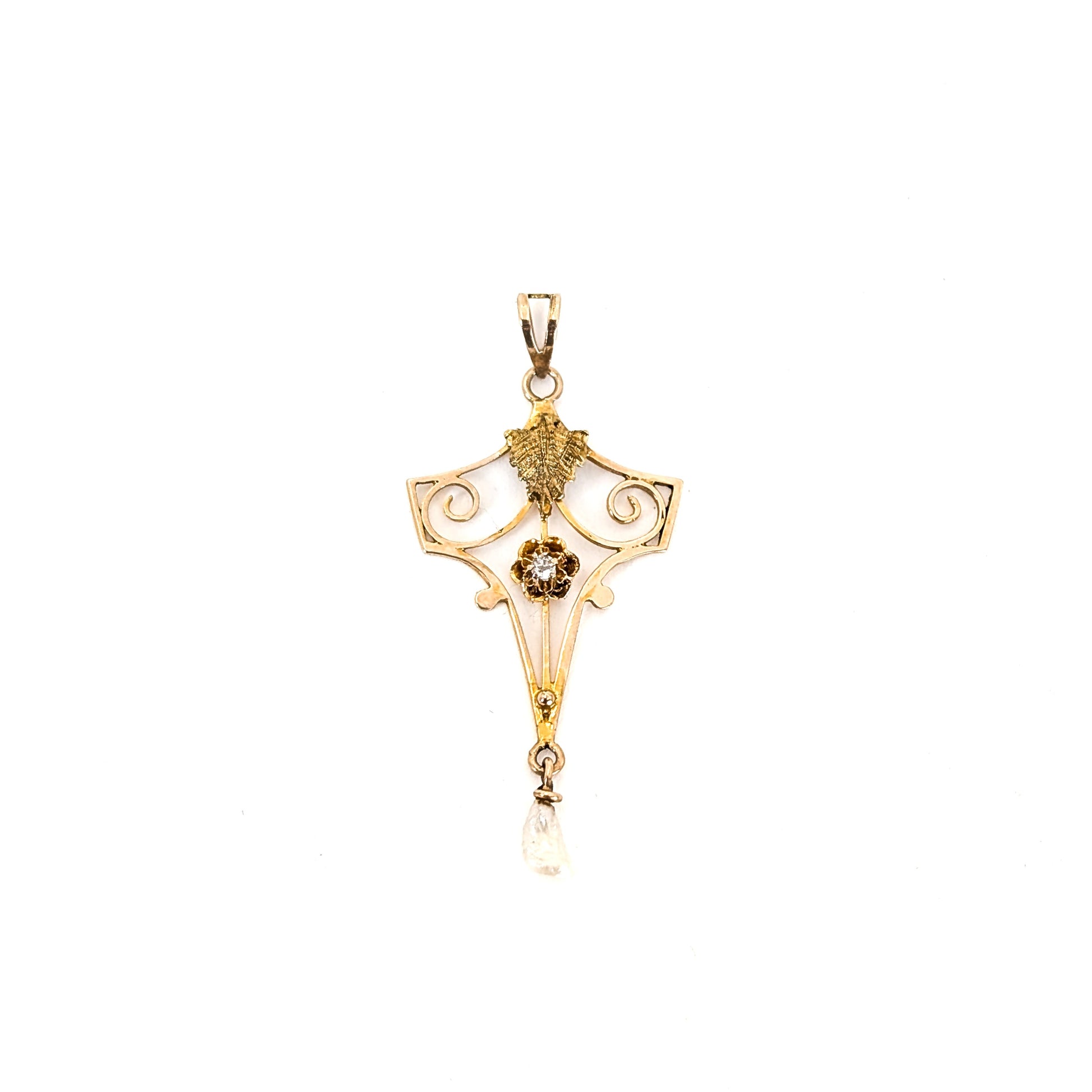A slender gold drop extends from the framework and ends in a softly irregular baroque pearl dangle, giving the piece lovely movement and that unmistakable antique charm. It’s an elegant, feminine pendant that is right at home with Art Nouveau–era jewelry and pairs beautifully with modern fine chains.
