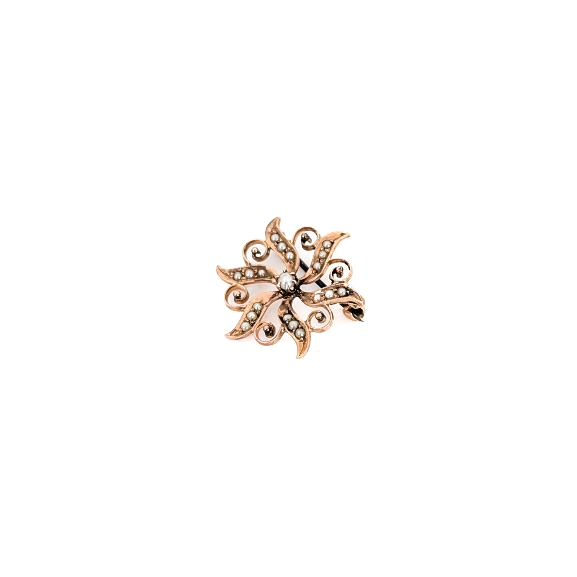 A delicate jewel from the late Victorian to early Edwardian era, this antique brooch is crafted in warm 10K rose gold and set with seed pearls in a swirling, pinwheel-like floral design. The softly curved tendrils create a sense of graceful movement, with lustrous seed pearls accenting each arm and a single pearl at the center.