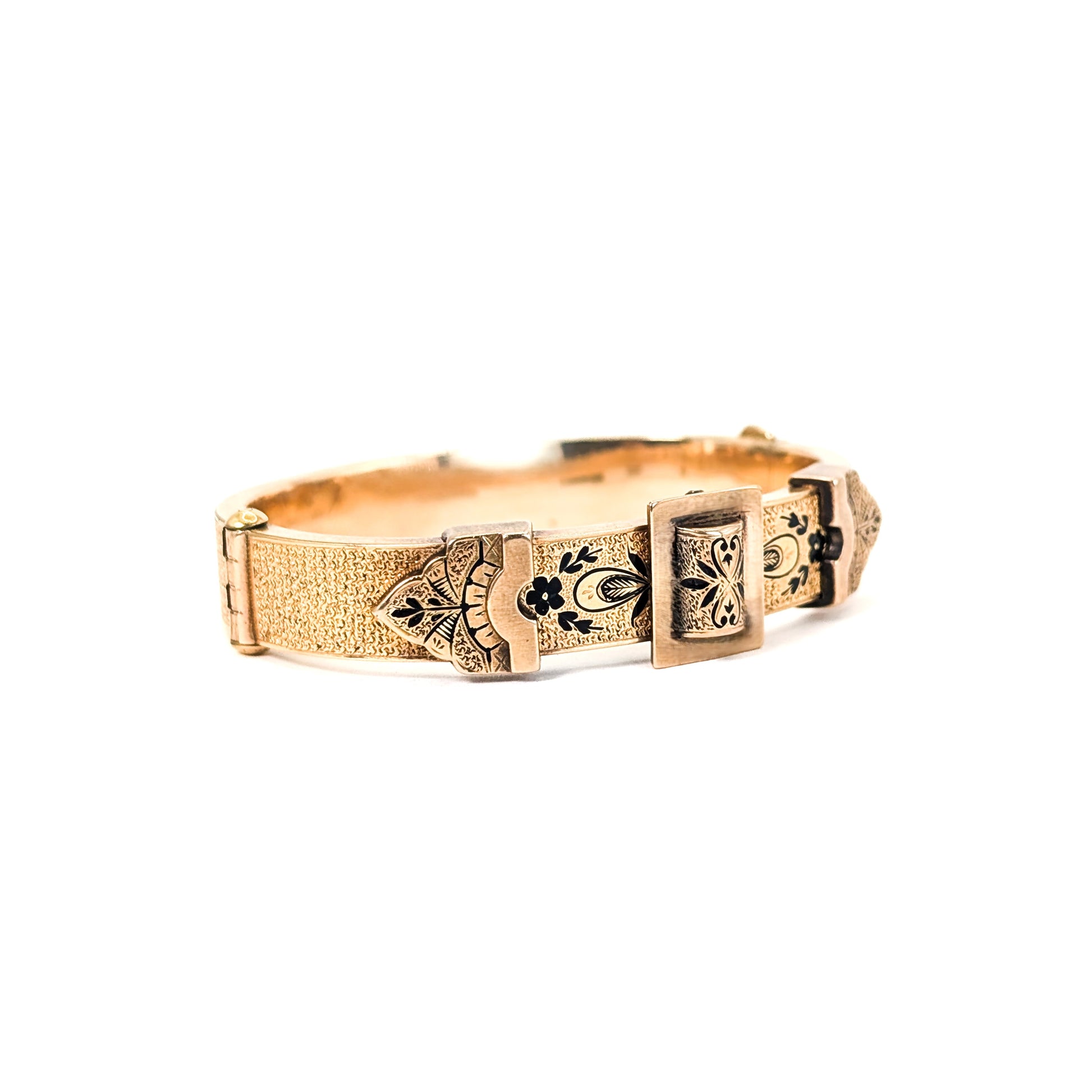 This antique 14K yellow gold buckle bracelet is a beautifully detailed example of Victorian Revival design, crafted with both elegance and substance. Weighing an impressive 21.45 grams, it has a satisfying, solid feel on the wrist.