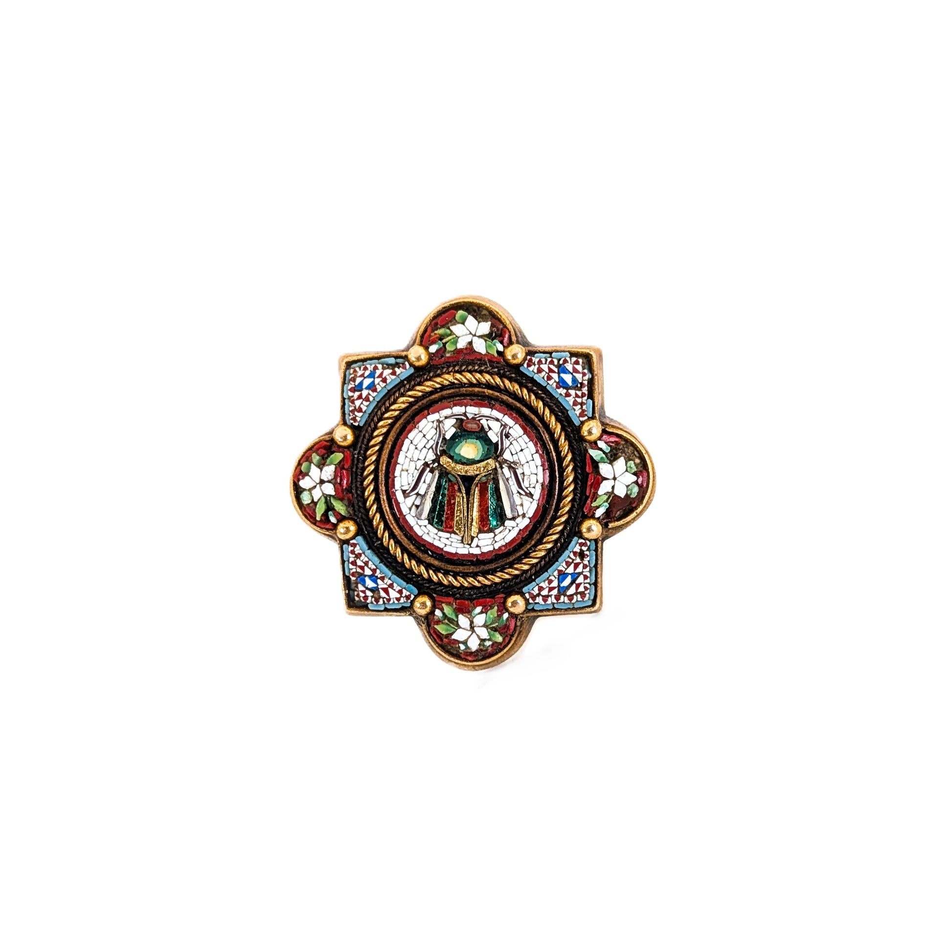 This exquisite antique scarab beetle brooch showcases the timeless artistry of micro-mosaic jewelry, meticulously handcrafted during the late 19th century Victorian period. The intricate design features a central roundel with a colorful micro-mosaic insect motif framed by a geometric border of vibrant red, green, and white tesserae. All set in a warm 14-karat gold mounting with rope and bead detailing.