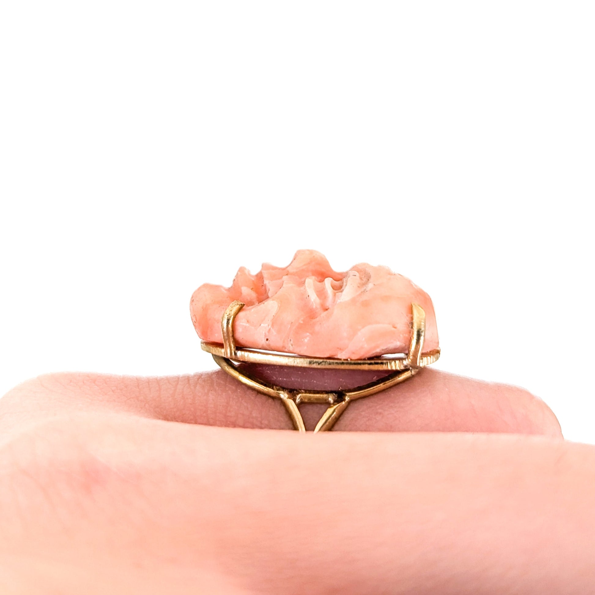 Antique 14K Yellow Gold Carved Coral Cameo Ring - Exquisite Taishō era Masterpiece