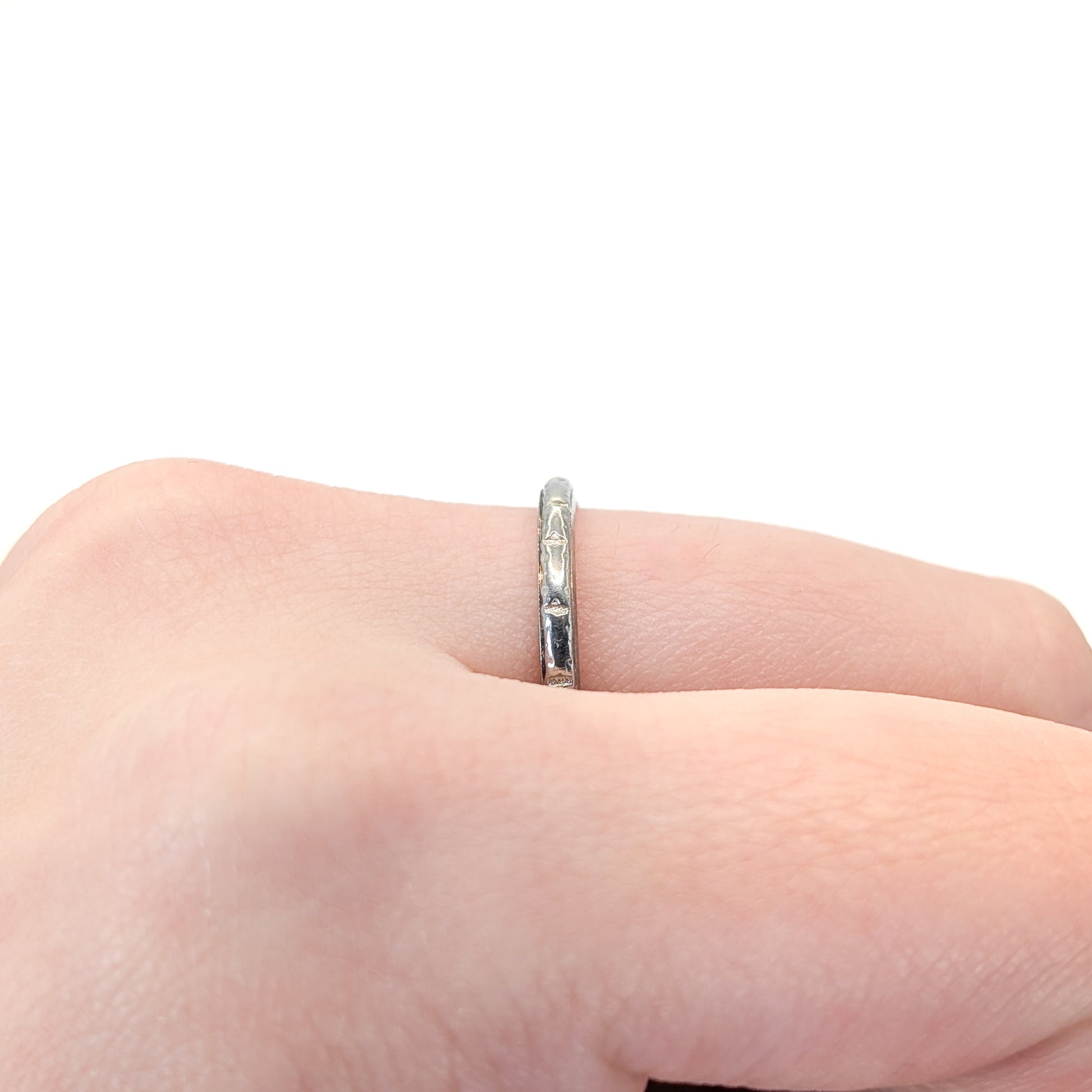 The ring features a continuous repeating pattern around the circumference, adding subtle texture and light play without overwhelming the minimalist profile. Slim, refined, and perfect for stacking, it makes a beautiful wedding band, right-hand ring, or addition to any vintage ring stack.