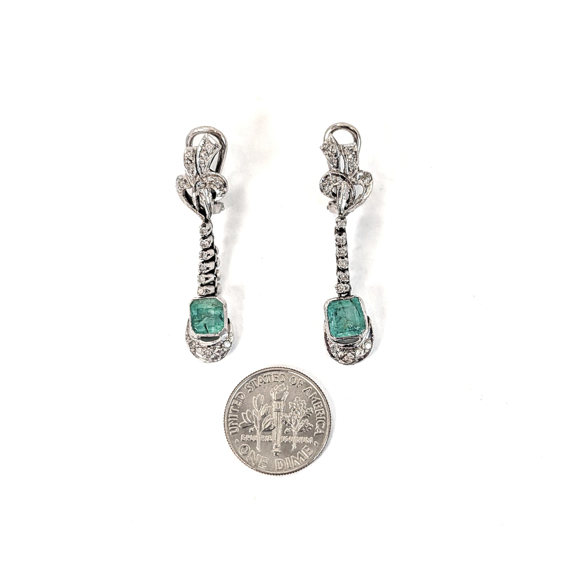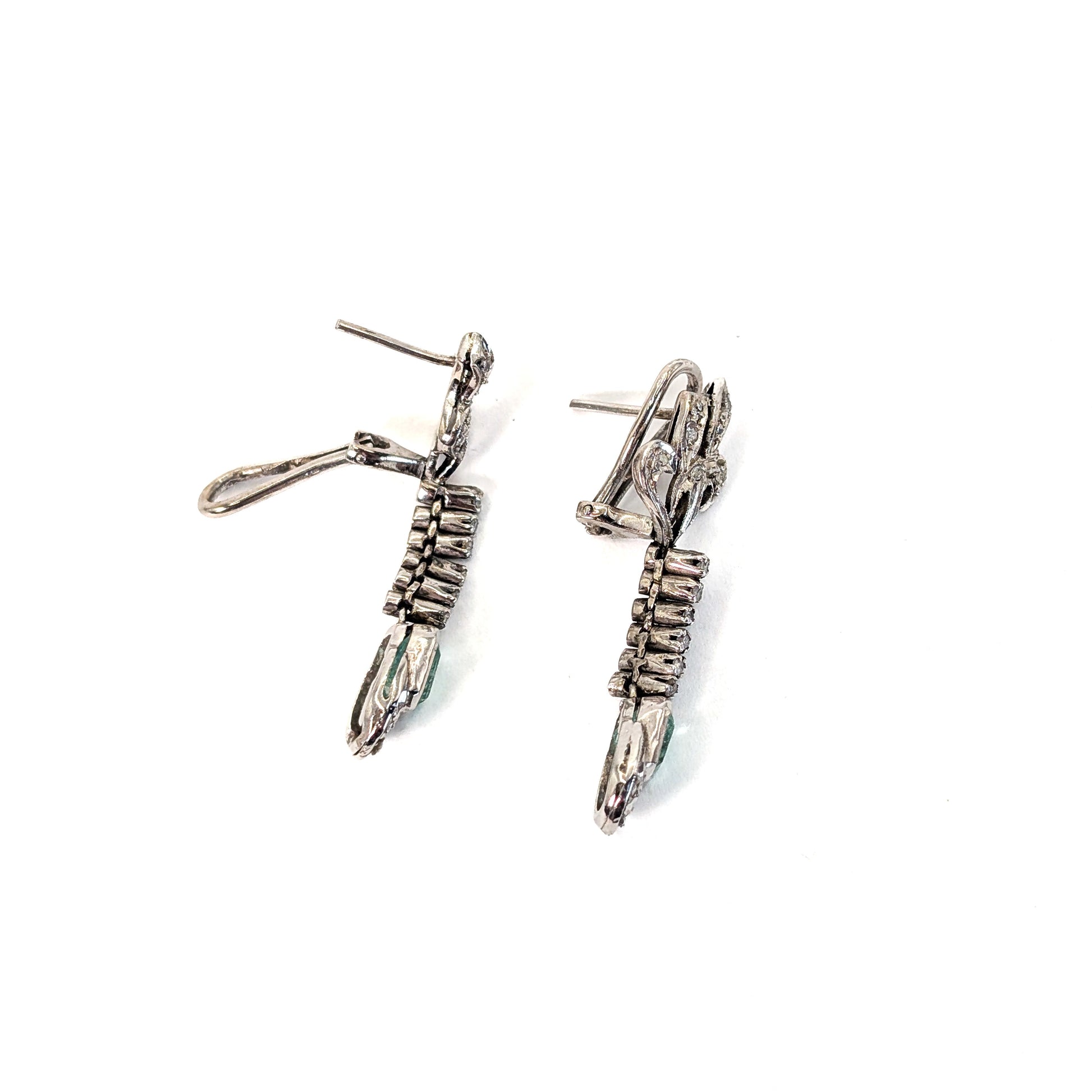 Vintage Palladium Diamond & Emerald Drop Earrings