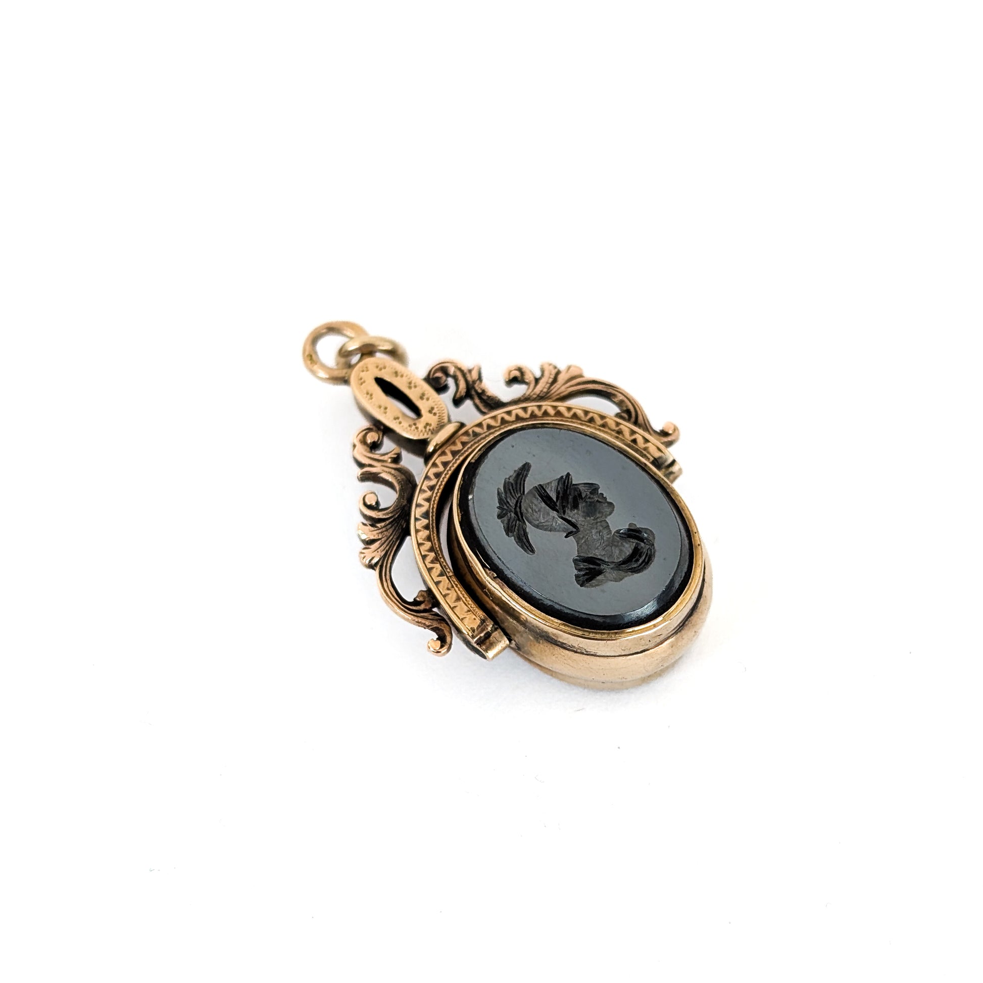 This remarkable Victorian swivel pendant Fob exemplifies the fine artistry and symbolism of the 19th century. Crafted in 64% gold (approximately 15K), it features a double-sided design — one side displays rich dark green bloodstone flecked with crimson, while the reverse reveals a finely carved hematite intaglio wax seal depicting a Roman soldier profile.