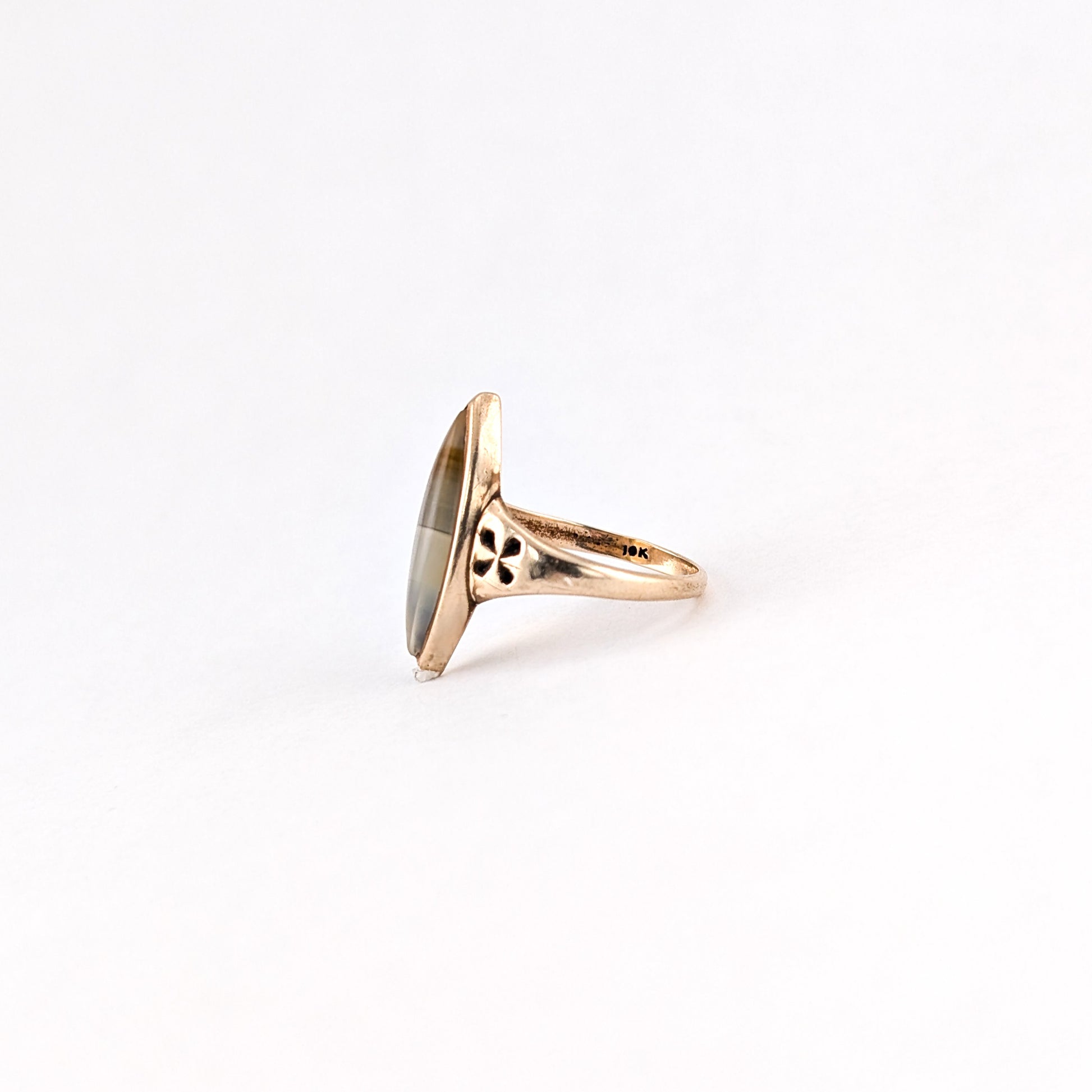 This antique 10K yellow gold ring features a striking navette-shaped banded agate cabochon set horizontally across the finger. The elongated silhouette gives the piece a bold yet refined presence, while the soft neutral tones of the agate shift beautifully in the light.