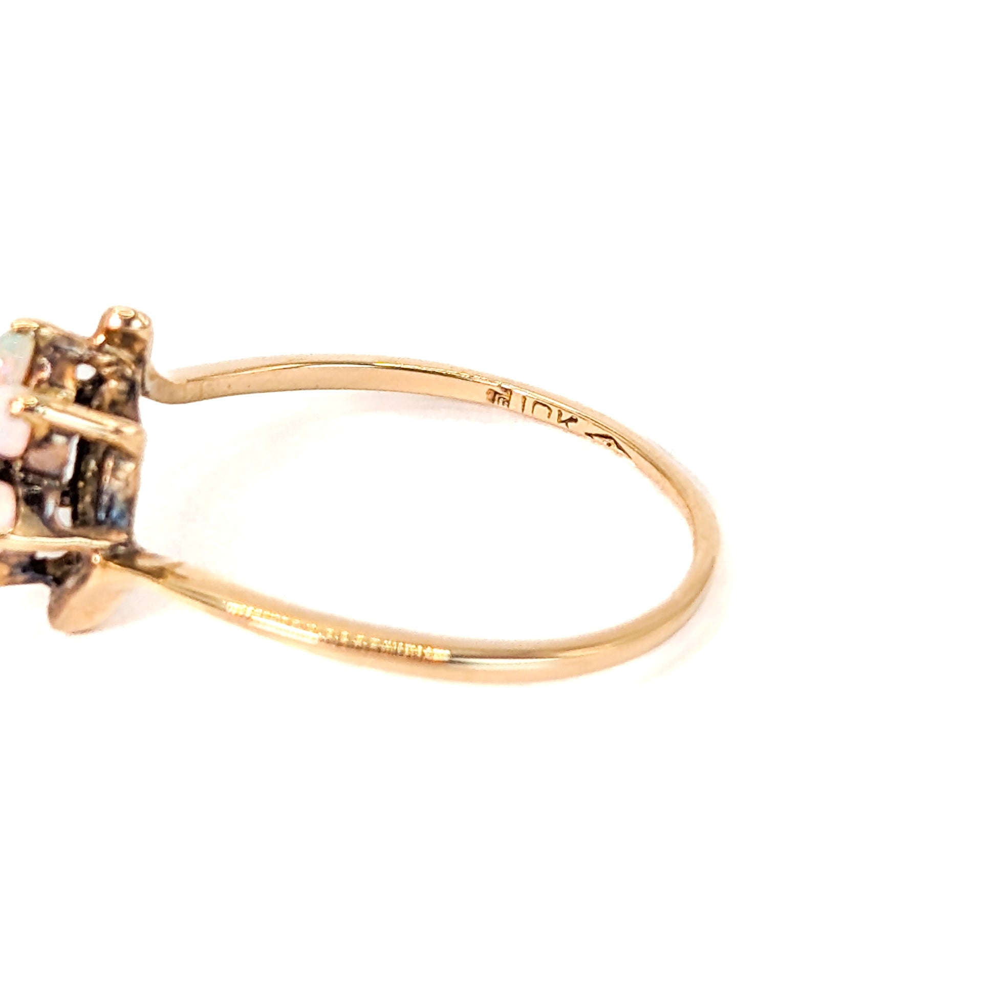 A charming vintage ring crafted in solid 10K yellow gold, featuring a cluster of luminous opals arranged in a floral-style setting. Each opal displays soft flashes of color, with subtle play-of-color that shifts in the light, giving the ring a delicate yet lively presence.
