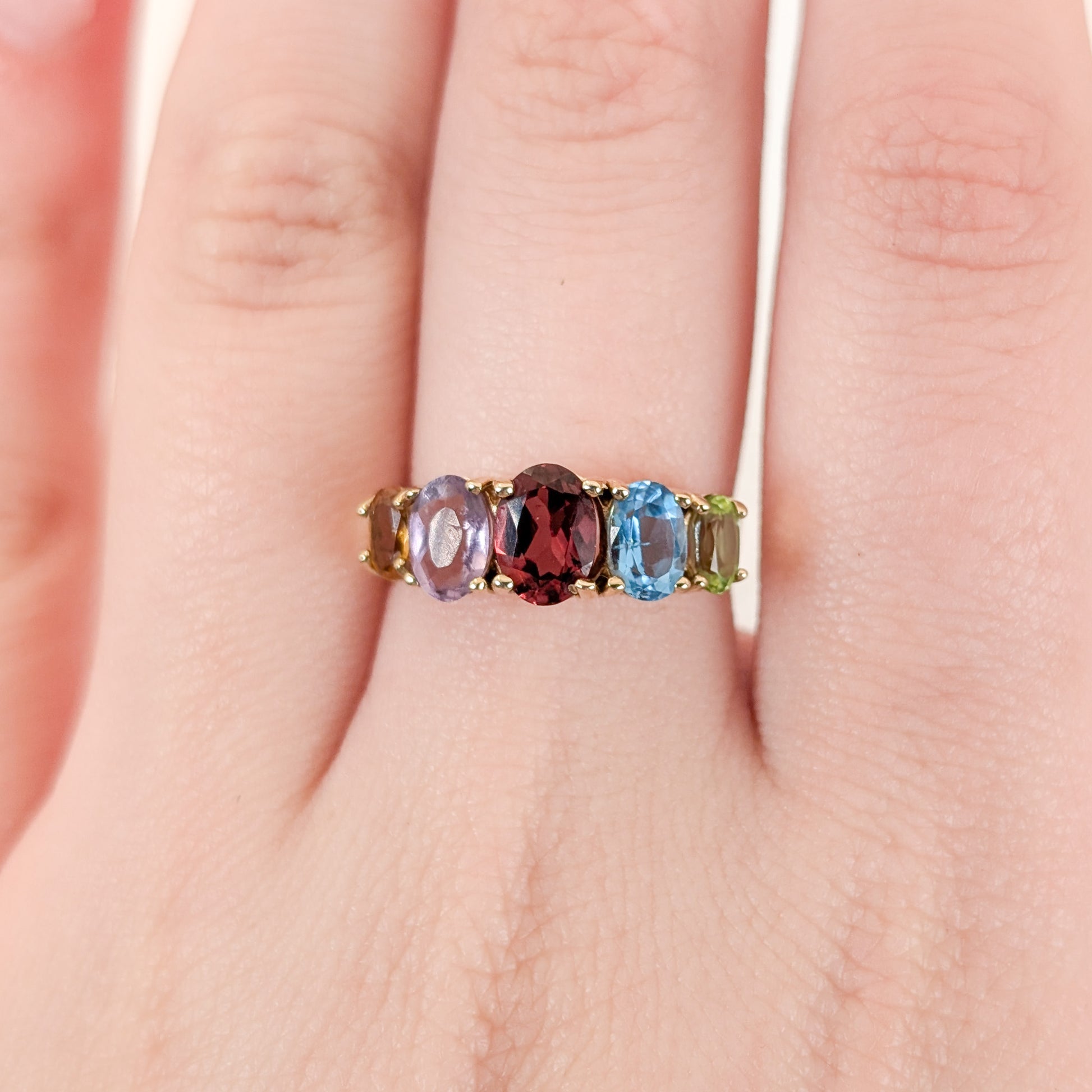Celebrate a rainbow of natural color with this vibrant five-stone band. Expertly crafted in warm 10K yellow gold, the ring features an elegant sequence of faceted oval gemstones: golden citrine, soft violet amethyst, deep red garnet, sky-blue topaz, and a lively green peridot. Each stone is prong-set to showcase its brilliance and allow light to pass through beautifully.