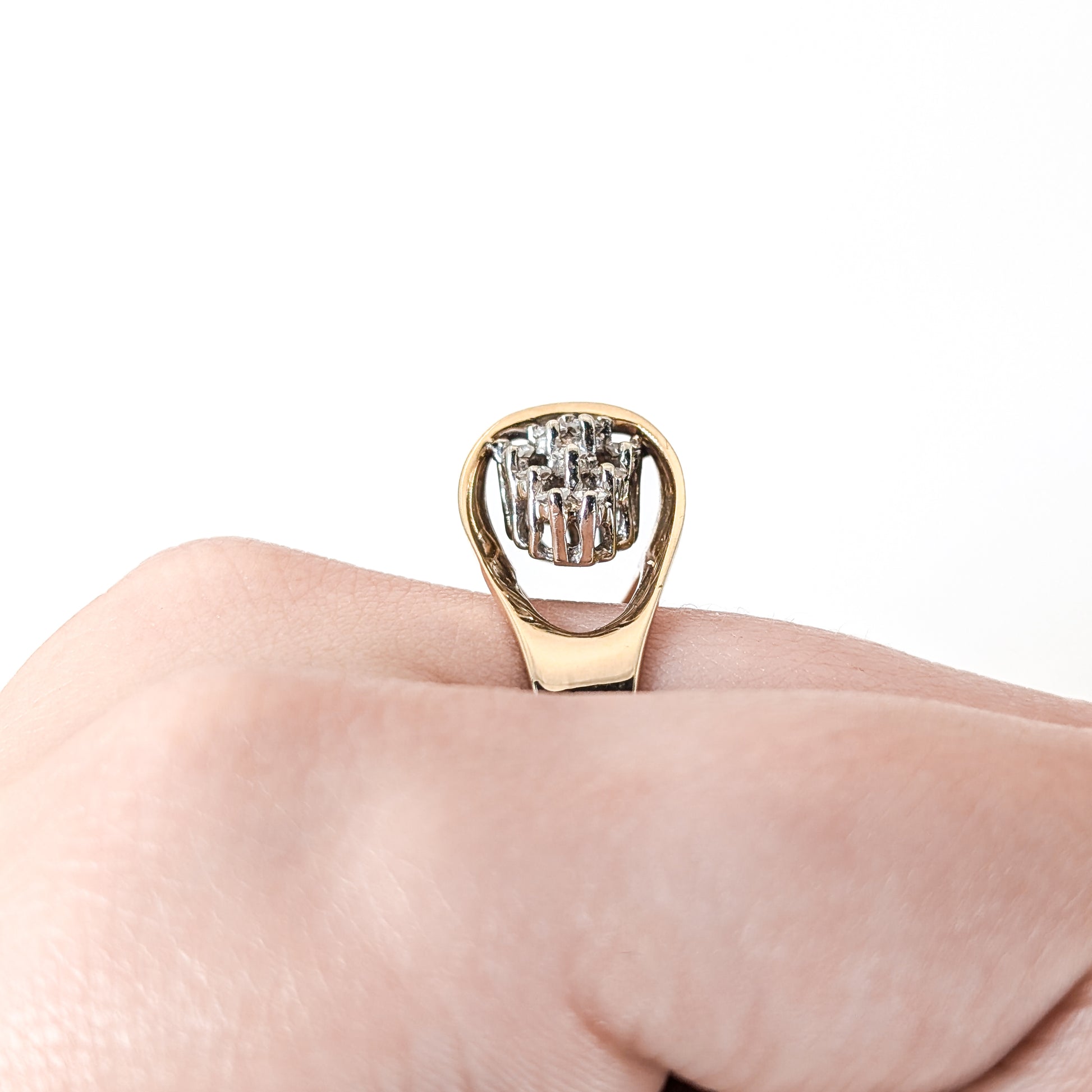 Stunning vintage 14K gold ring featuring a dazzling cluster of small diamonds arranged in a unique pyramid shape. The sleek, polished gold band curves gracefully around the stones, creating a sophisticated and timeless look. Perfect for everyday wear or as a special gift, this vintage piece adds a touch of sparkle and history to any occasion.