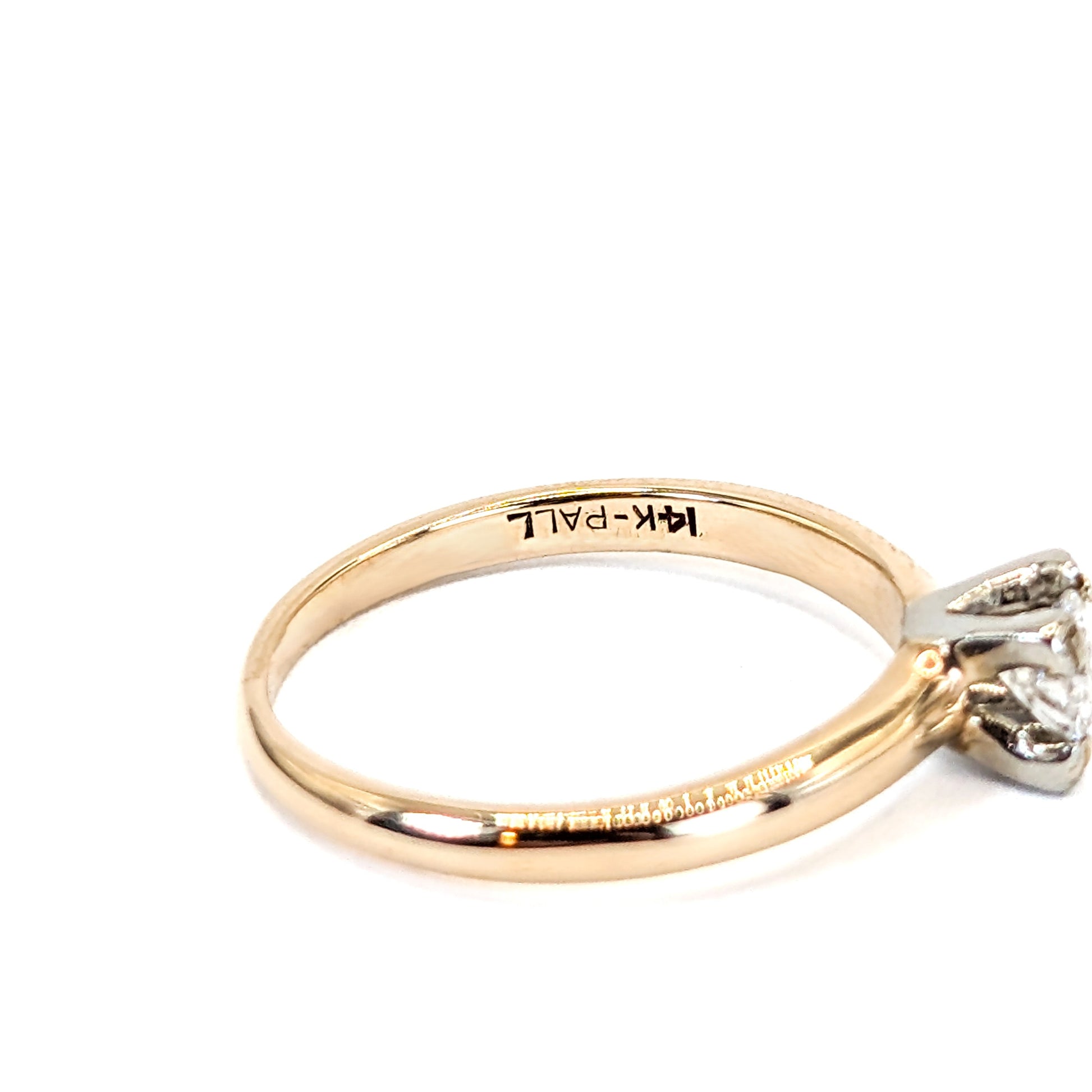 This vintage two-tone solitaire ring showcases a bright round brilliant diamond in a palladium four-prong setting. The contrast between the cool-toned palladium head and the warm 14K yellow gold band creates a timeless look that highlights the stone’s fire and brilliance.