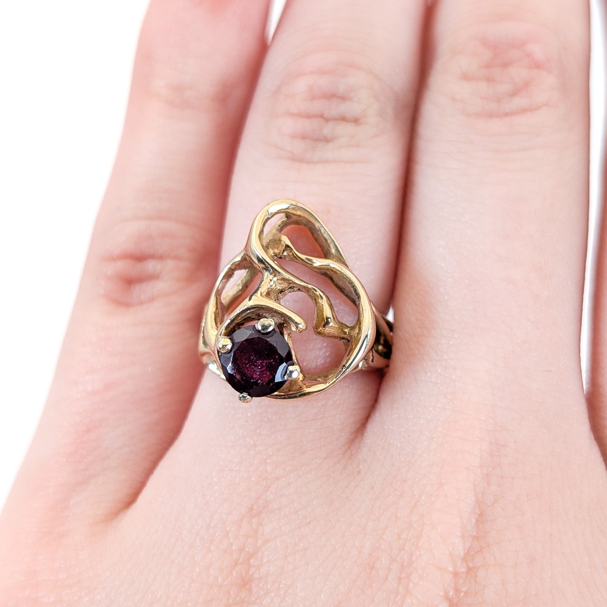 This striking vintage ring embodies the bold artistry of the Brutalist movement, featuring an open, freeform gold structure that appears almost sculpted by hand. At its center sits a deep garnet, its rich wine-red hue contrasting beautifully against the warm glow of solid 14K yellow gold.