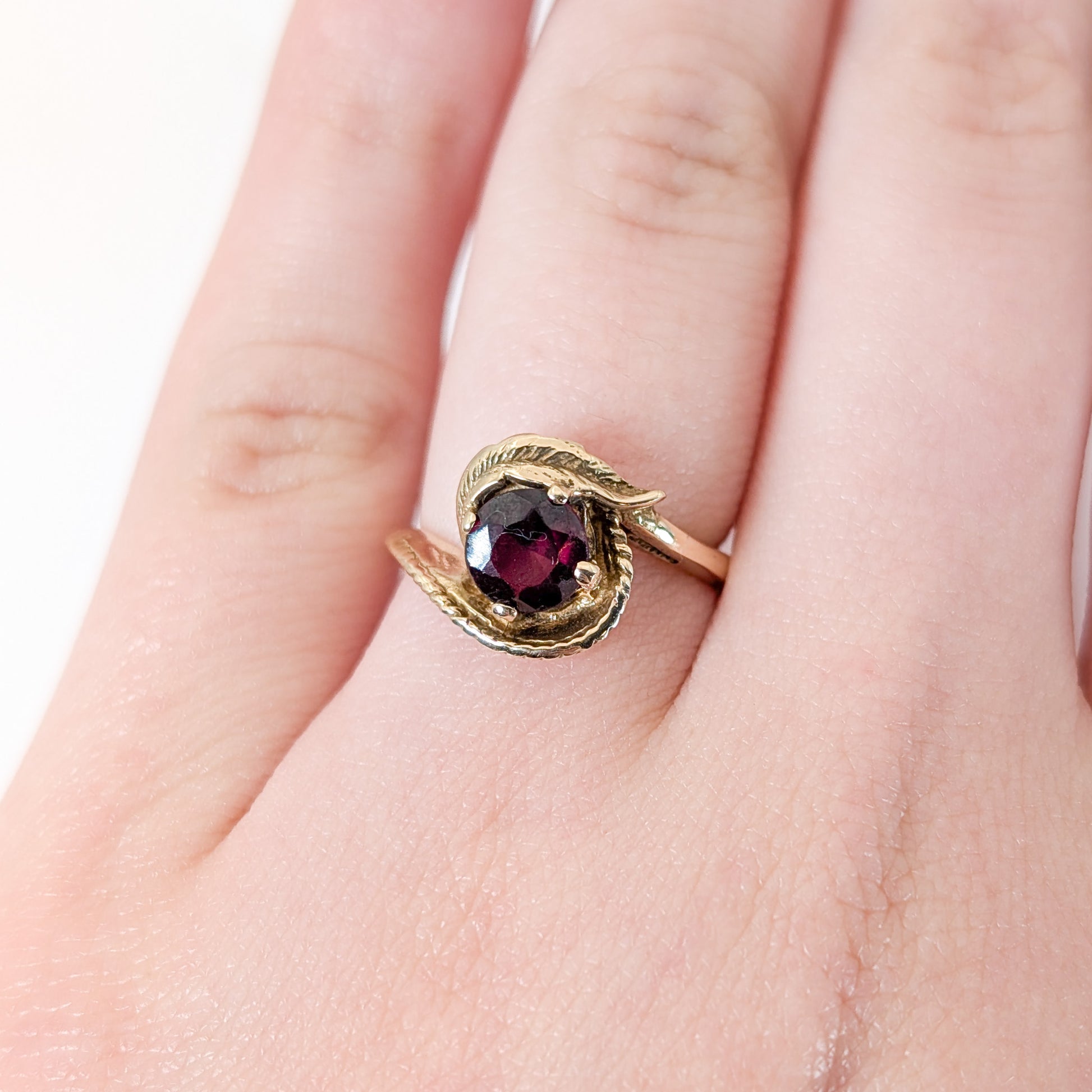 Unleash your inner mystique with this captivating vintage 14K gold garnet feather ring, a true masterpiece of design and symbolism. This elegant piece features a beautifully sculpted feather motif, the gold band sweeping gracefully around the finger like a delicate plume caught in motion. At its center lies a deep, rich red garnet, securely set and glowing with passion and vitality.