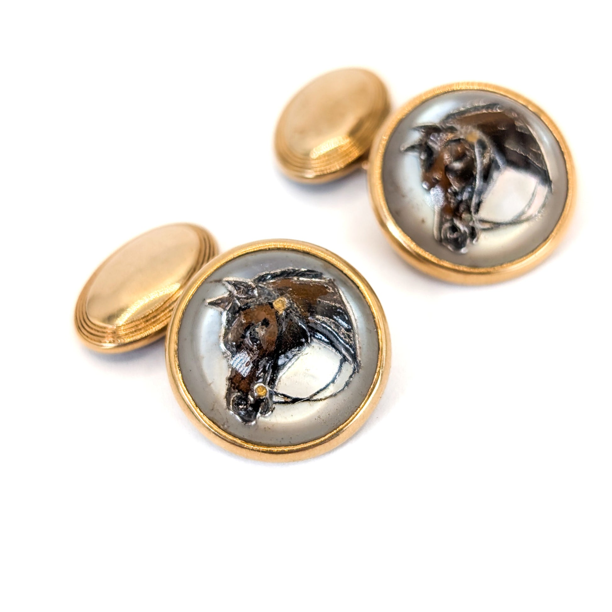 Vintage 14K Gold Painted Horse Head Cufflinks – Reverse Intaglio Crystal Domes