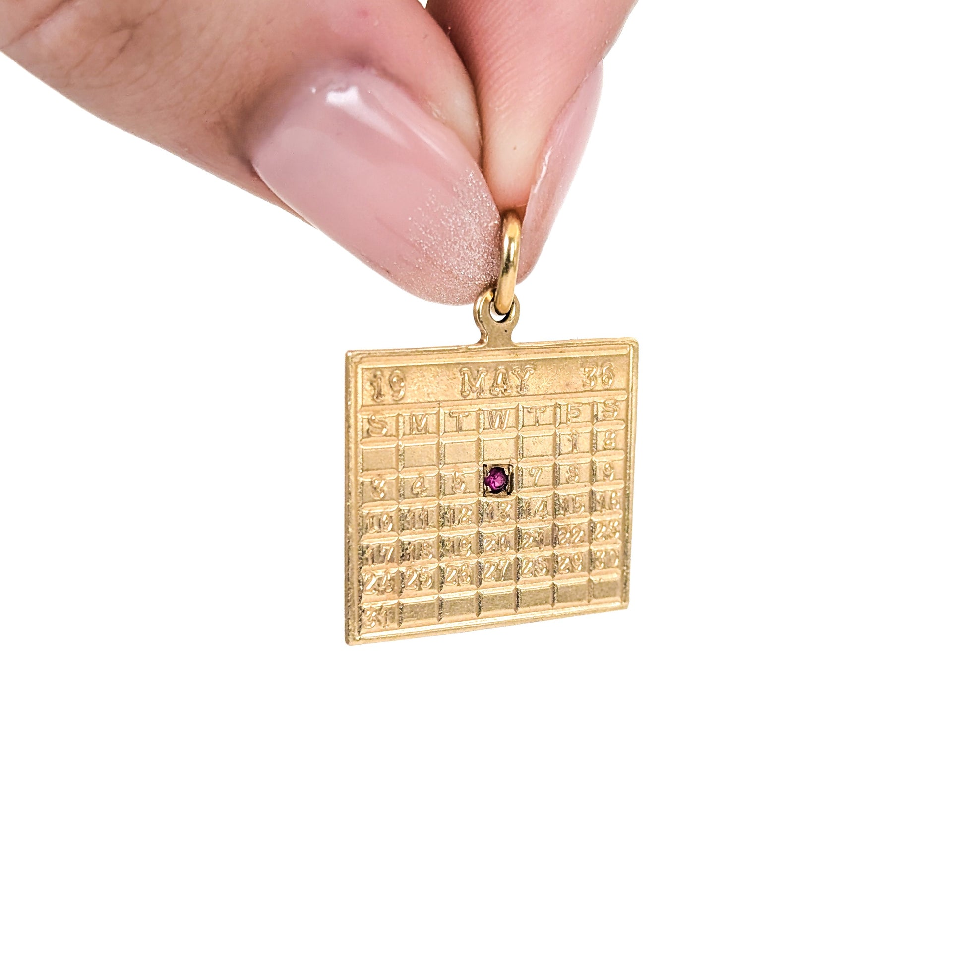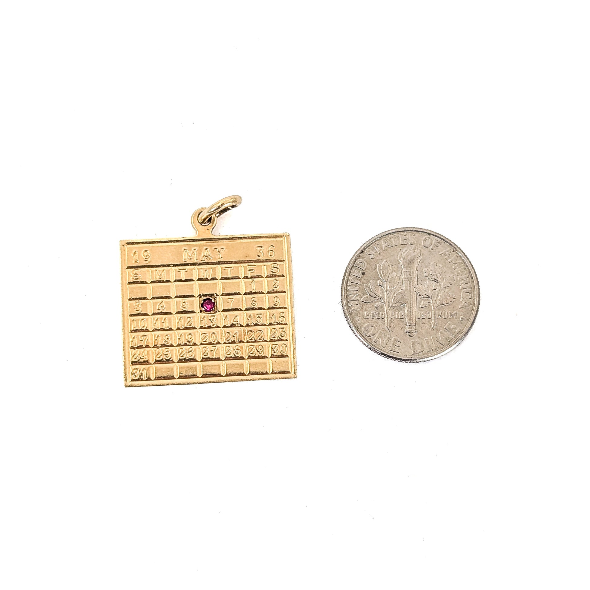 This petite mid-century calendar charm is crafted in rich 14K yellow gold and centered with a tiny ruby marking a special date. The front is laid out as a full month calendar for May 1936, with raised numerals and neatly framed days. A single round ruby is set into the 6th day square, calling out a meaningful moment worth remembering.