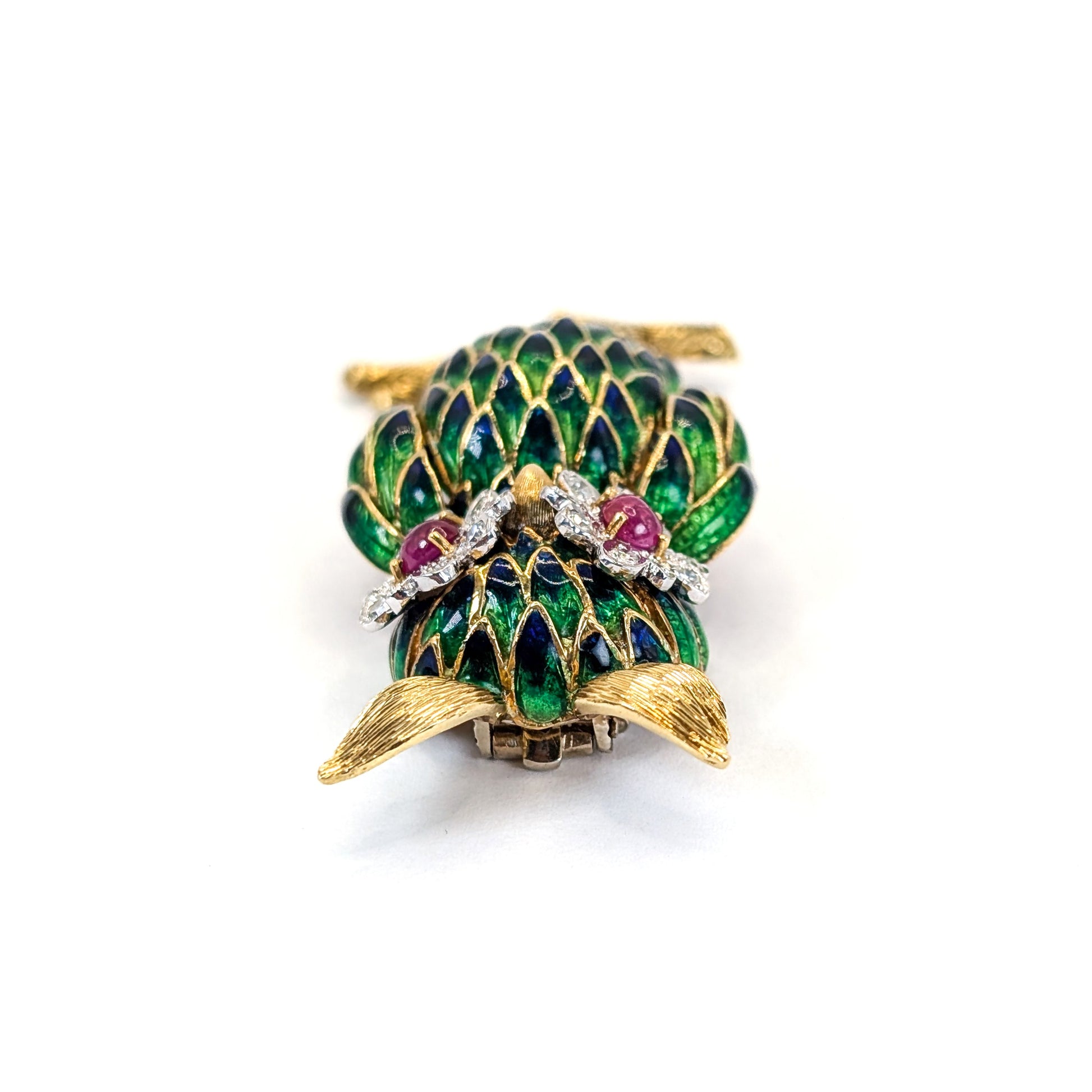 This exceptional vintage owl brooch is finely crafted in solid 18K yellow gold and richly adorned with luminous green and blue enamel. The owl’s expressive eyes feature natural ruby cabochon centers encircled by single-cut diamonds, arranged in elegant cluster settings that bring warmth, depth, and character to the design.