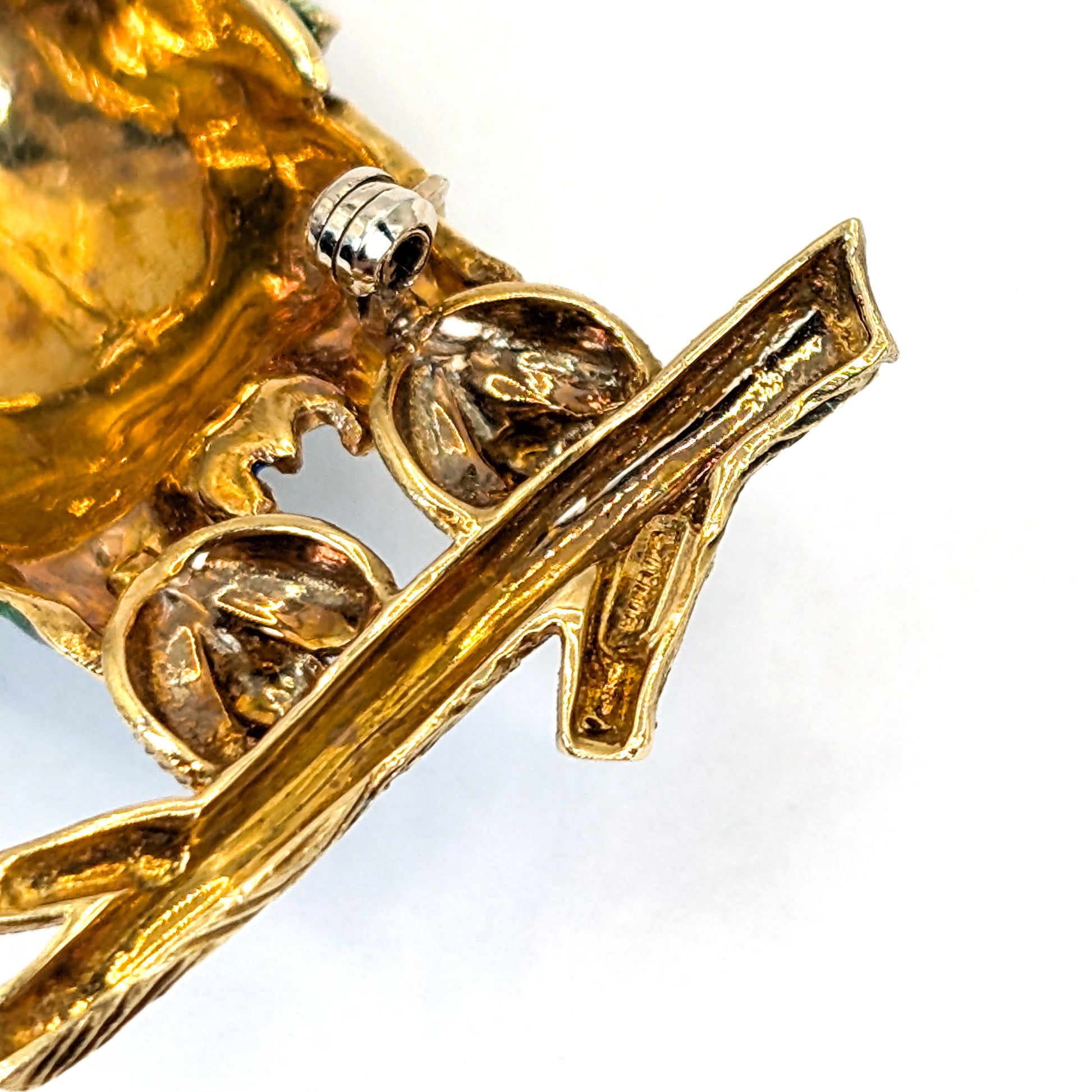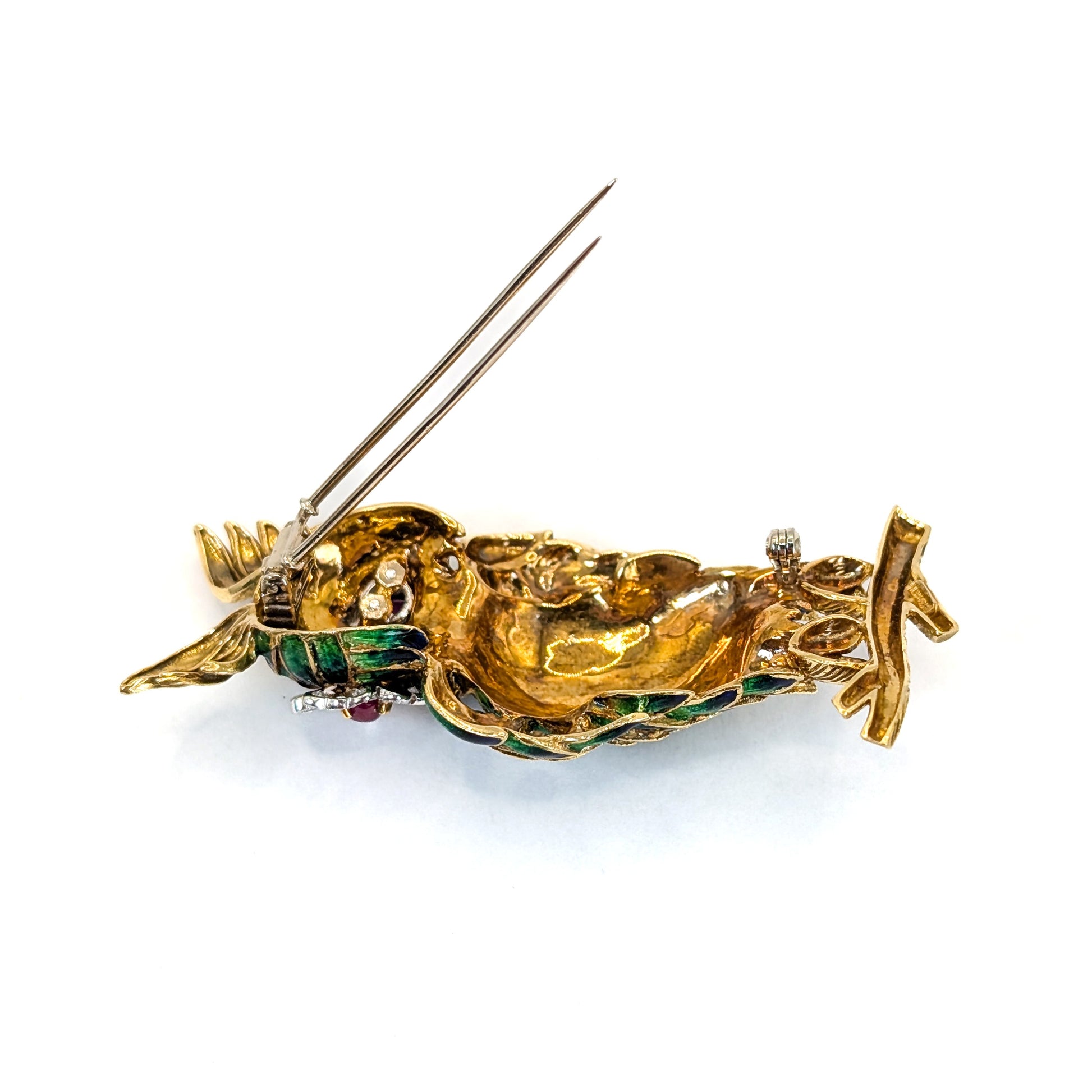 The body showcases meticulously detailed feather-pattern enamel framed by raised gold outlines, a hallmark of high-quality mid-century enamel work. Textured gold wings, talons, and branch complete the sculptural form, demonstrating the level of craftsmanship associated with fine jewelry of the mid 20th century.