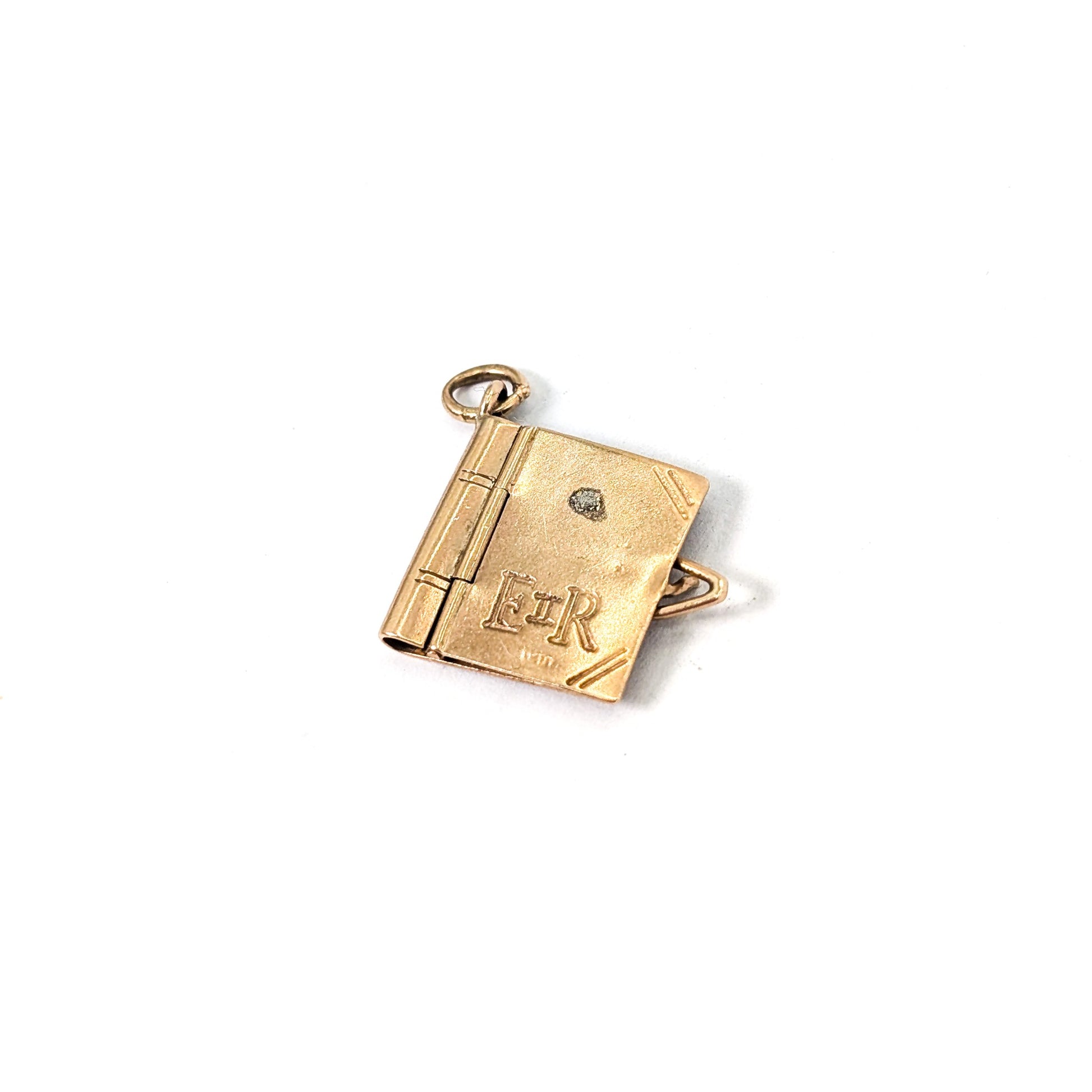 A story you can carry. This vintage 9K gold charm is designed as a miniature book, complete with engraved initials “E II R” for Elizabeth II Regina. The charm opens on a working hinge to reveal a tiny interior photo compartment, still containing its original vintage photograph insert.